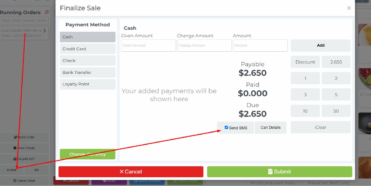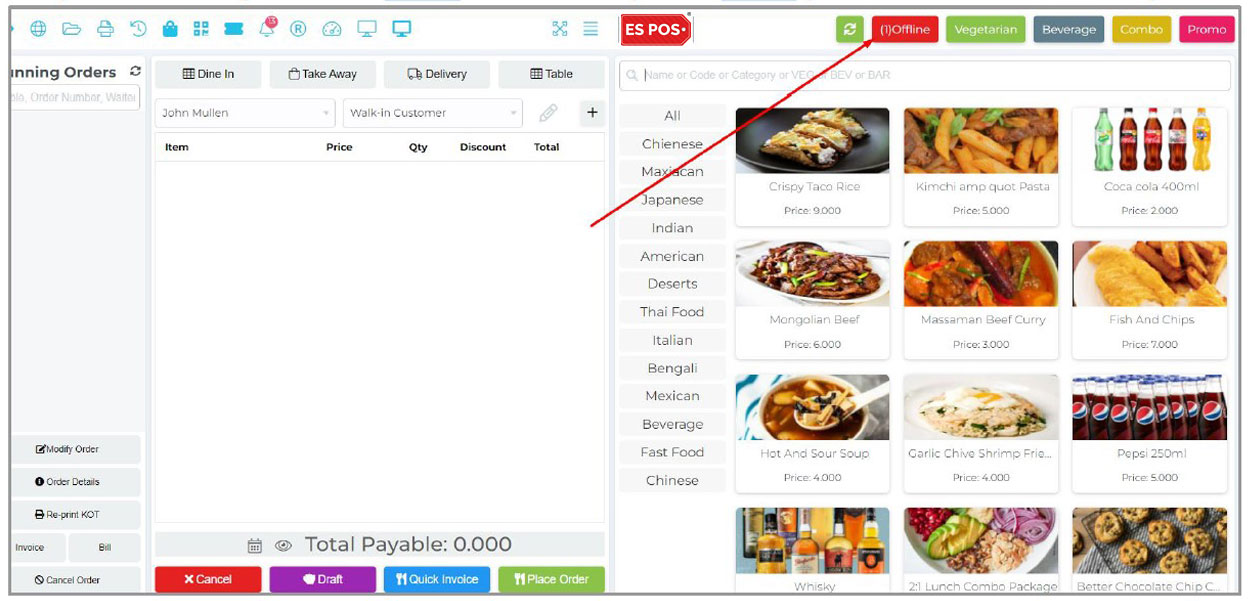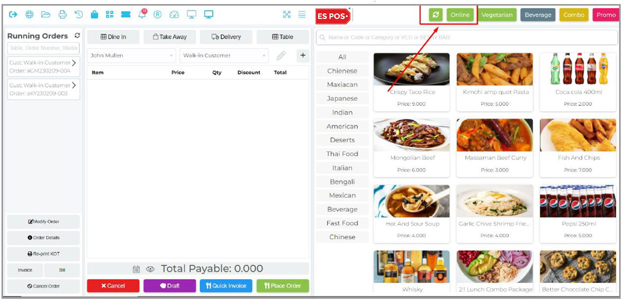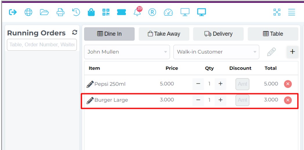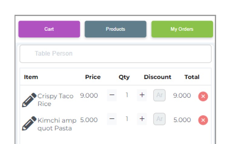 Post & Pre-payment Support, Running Orders, Add New Item to Running Order, Running Order Cancel, KOT Print/Kitchen Update for Only Modified Items, Dine In, Take Away, Delivery Order, Service/Delivery Charge, Table With Time Tracking, Instant Item Search, Most Selling Items Appear First, One Click To Find All Veg Items, One Click To Find All Beverages, Print KOT, Kitchen Notification, Discount by Item, Discount on Total, Discount by Fixed or Percentage, Waiter Assignment, Instant Customer Add Option, Hold Sale, Tab Responsive.