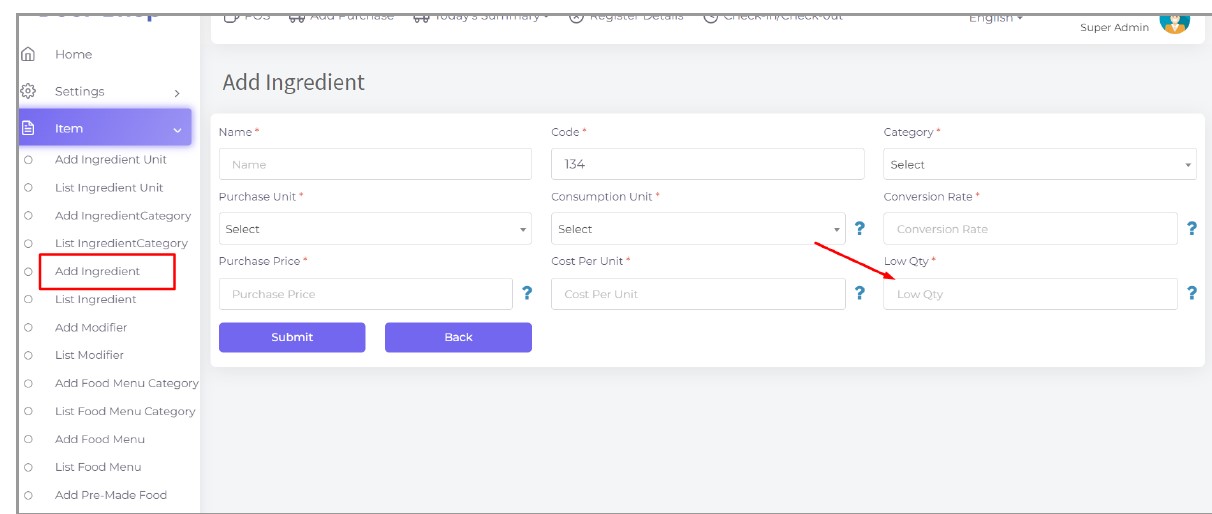 Using this module you can see how much ingredients you have in store under low stock and you need to purchase right now. This will mark it as red when the stock is under the low stock. We set the low stock quantity in the ingredient profile.