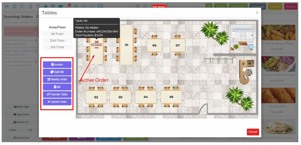 Table Management, Realistic Table Layout Design, Area Wise Table Management, Table Selection for Dine In, Table Time Tracking, Restrict Table Selection On Ongoing Table etc.